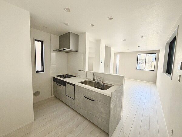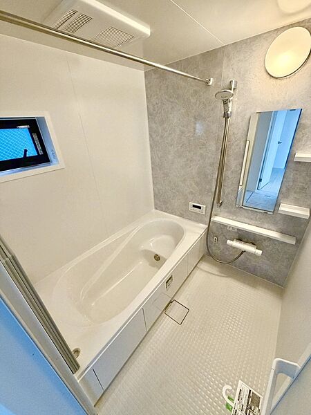 1坪サイズの浴室は暖房乾燥機付き。LDKは対面キッチン採用の新築分譲住宅。