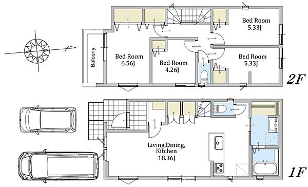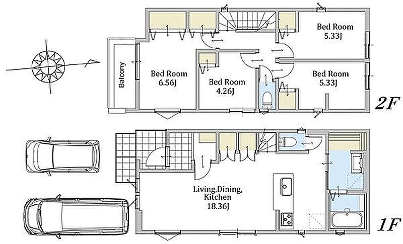 並列駐車2台可能。LDKは広々18畳以上。南側接道で陽当り良好な新邸です。