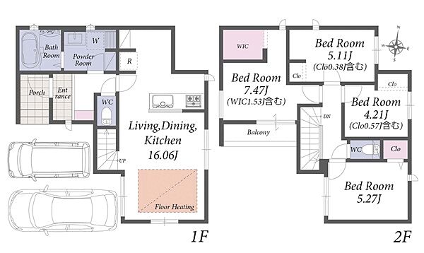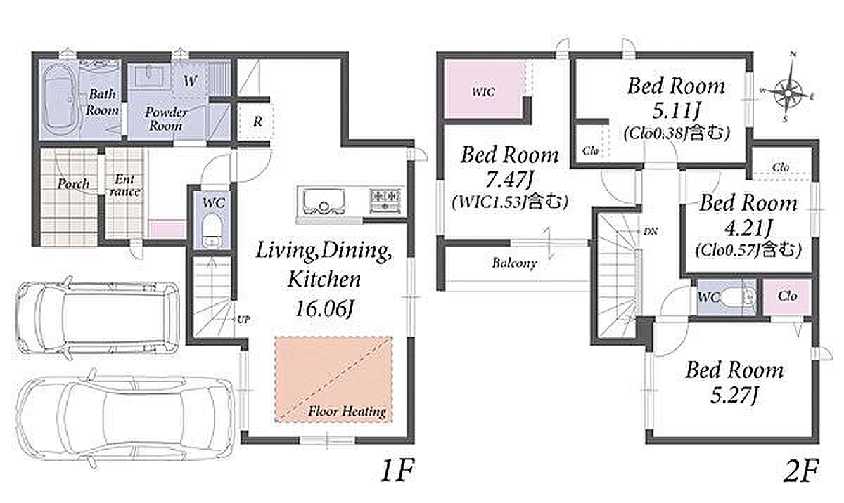 並列駐車2台可能。LDKは対面式キッチンを採用した新築分譲住宅です。