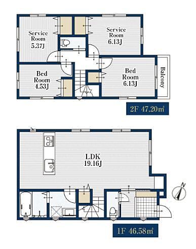 対面式キッチン採用のLDKは広々19畳。全室収納付きの2階建て新邸です。