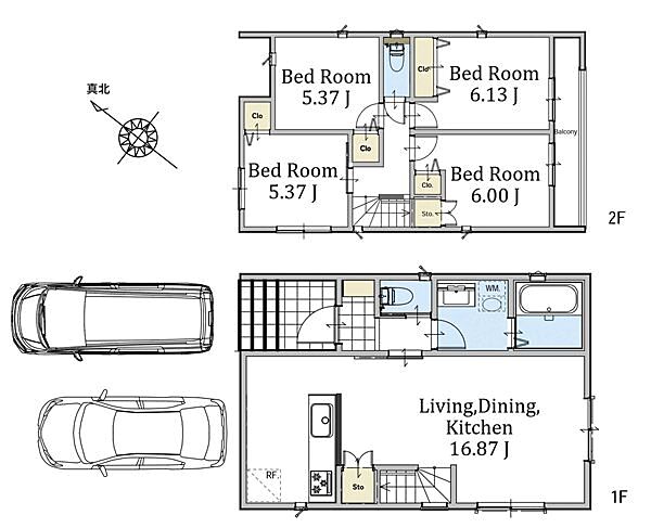 並列駐車可能なカースペース付き。4LDKの2階建て新築分譲住宅です。