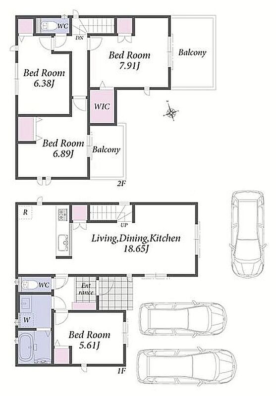 3台駐車可能なカースペース付き。LDK18畳の2階建て新築分譲住宅です。