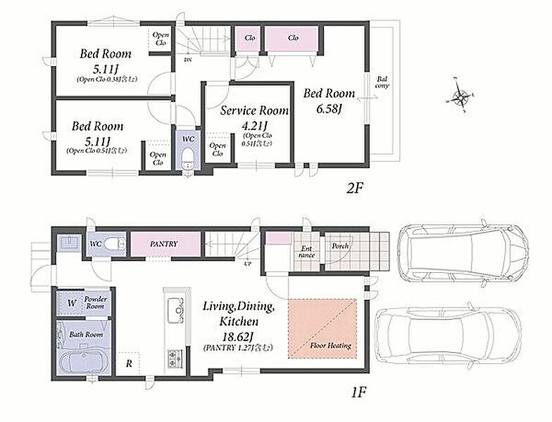 1階に床暖房付きのLDK。お車2台駐車可能な2階建て新築分譲住宅です。