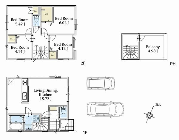 並列2台駐車可能なカースペース付き。ルーフバルコニー採用の新邸です。