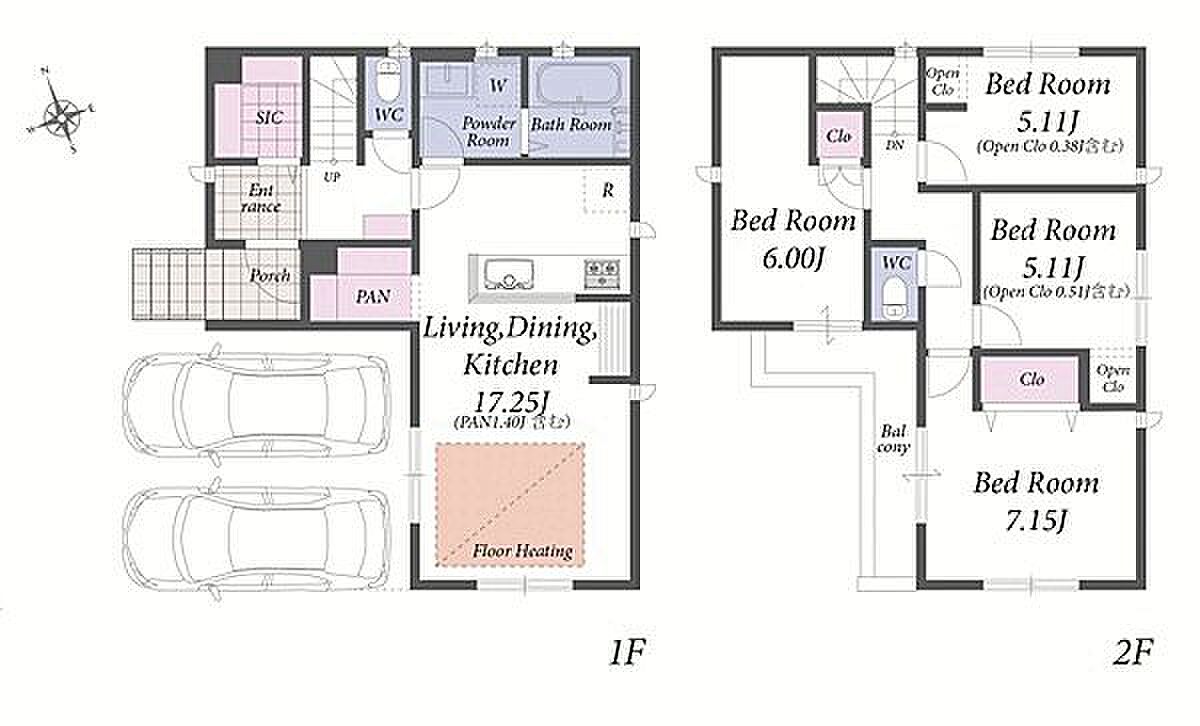 並列2台駐車可能なカースペース付き。角地につき開放感のある2階建て新邸。