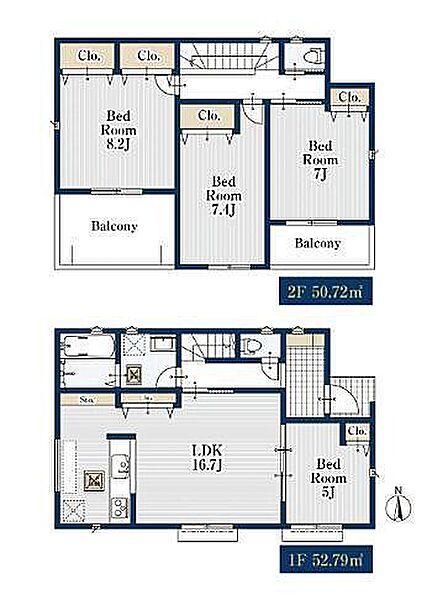 全室南向き。主寝室は8畳と広々な住空間。並列3台駐車可能な新邸です。