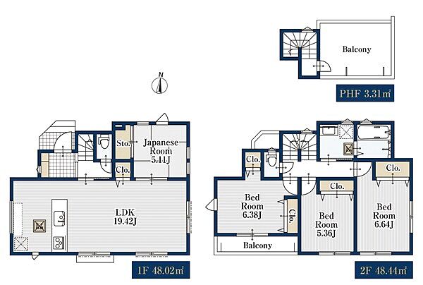 開放感のある三方角地。ルーフバルコニー付きの2階建て新築住宅です。
