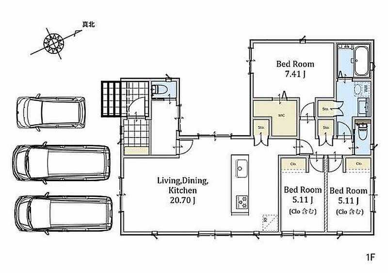 お車並列3台駐車可能。対面式キッチン採用の木造平屋建て新築分譲住宅です。