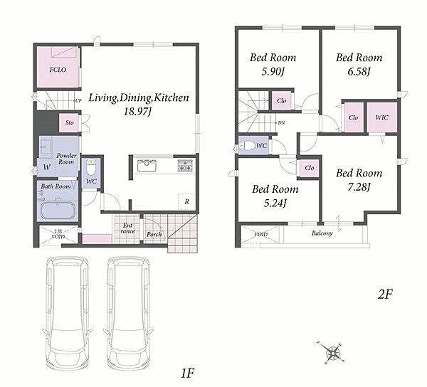 並列2台駐車可能なカースペース付き。ZEH水準仕様の省エネ住宅です。