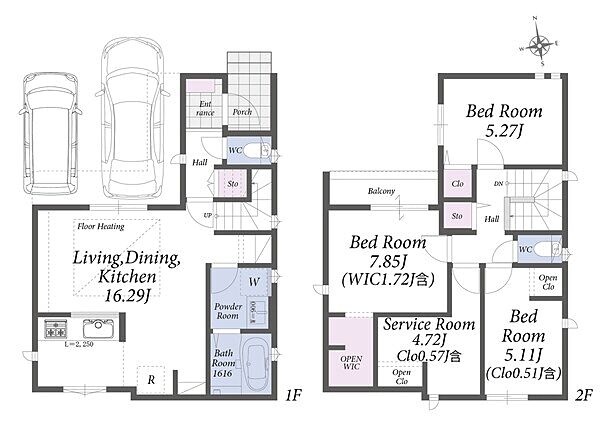 1階LDKで生活導線が良い間取り。カースペース2台付の2階建て新邸です。