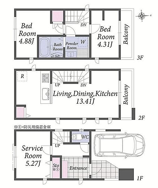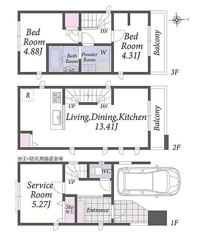 | 備考 | 車庫等5.56m2含/軽自動車のみ/景観法/宅地造成工事規制区域/準防火地域/備蓄用倉庫1.08m2含(1号棟のみ)/バルコニー0.68m2含(1号棟のみ)/私道部分8.21~8.59m2/管理番号:603026 | ||