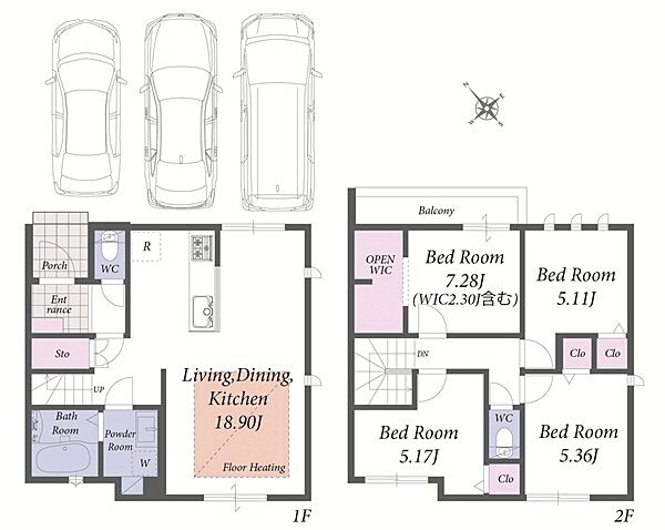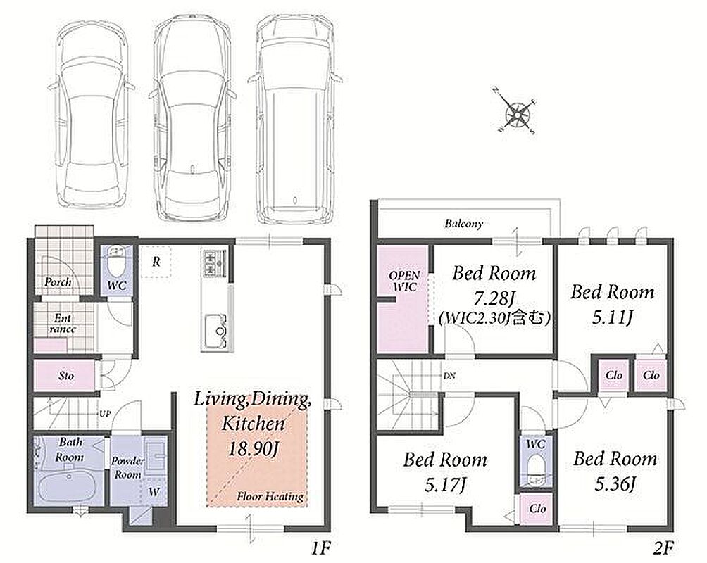 並列駐車3台可能なカースペース付き。LDKは広々18畳の新築戸建です。