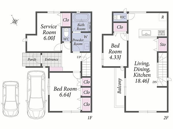 並列2台駐車可能なカースペース付き。LDKは広々18畳の2階建て新邸です。