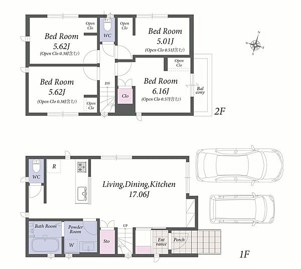 並列駐車可能なカースペース付き。ZEH水準仕様の2階建て省エネ住宅です。