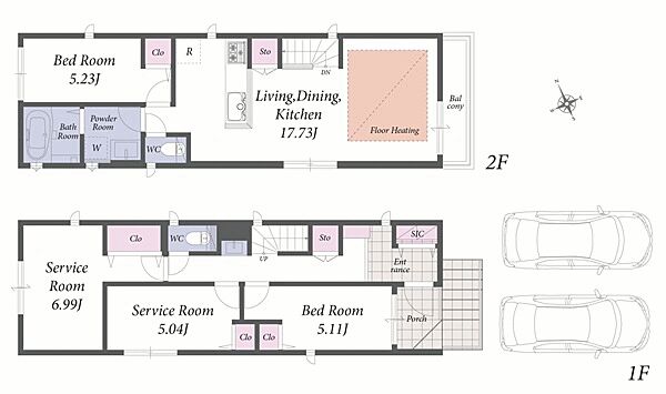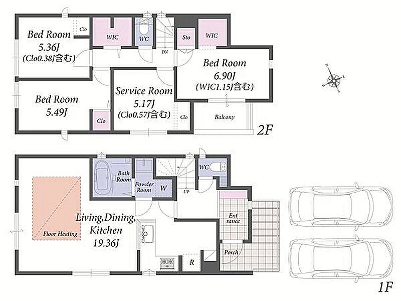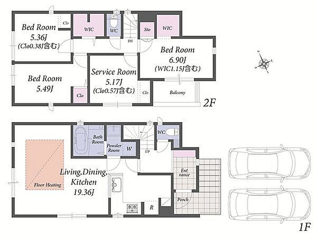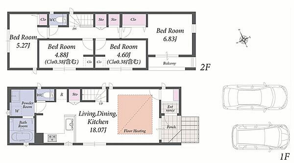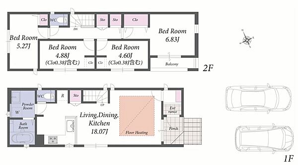 並列2台駐車可能なカースペース付き。対面式キッチン採用の新築分譲住宅です。