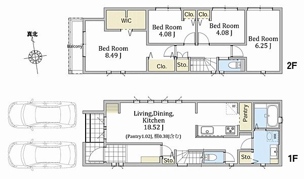 並列2台駐車可能。ウォークインクローゼット付。ZEH水準の省エネ住宅です。