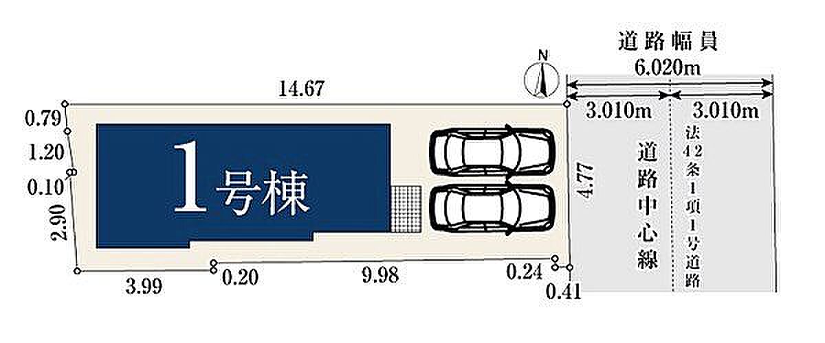 前面道路は広々とした6m公道。カースペース並列2台駐車可能な新築住宅です。