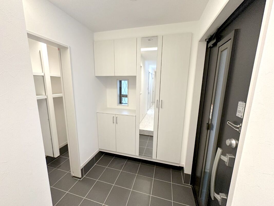 大容量のトールタイプの玄関収納つき。姿見付きですのでお出かけ前...