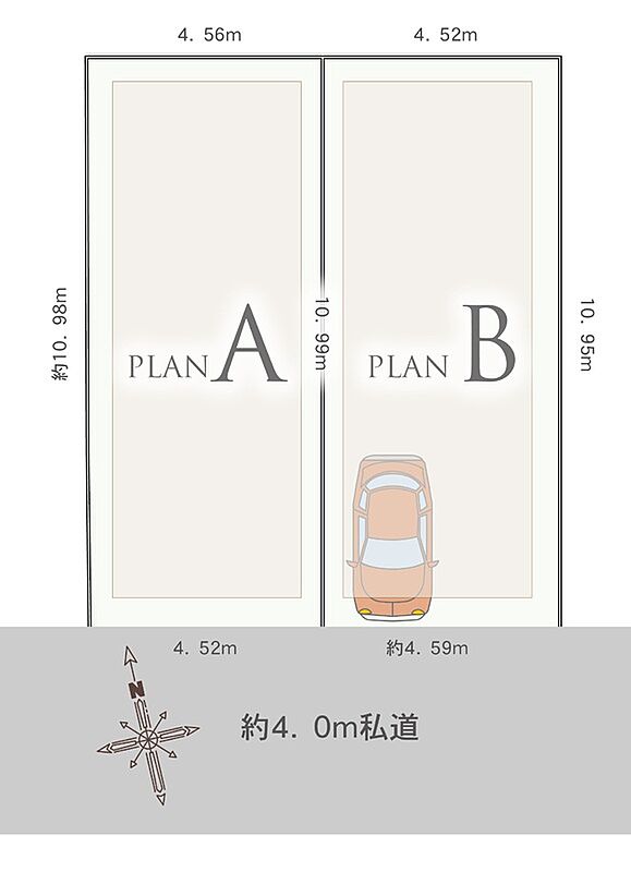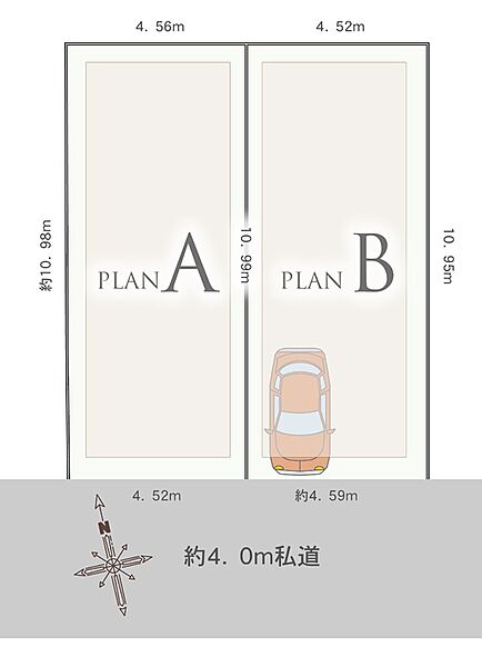 | 駐車場 | 1台(B号棟のみ(車種限定)) | 道路の幅員 | 南側約4.0m私道(私道部分34.22m2のうち持分1/2あり) |