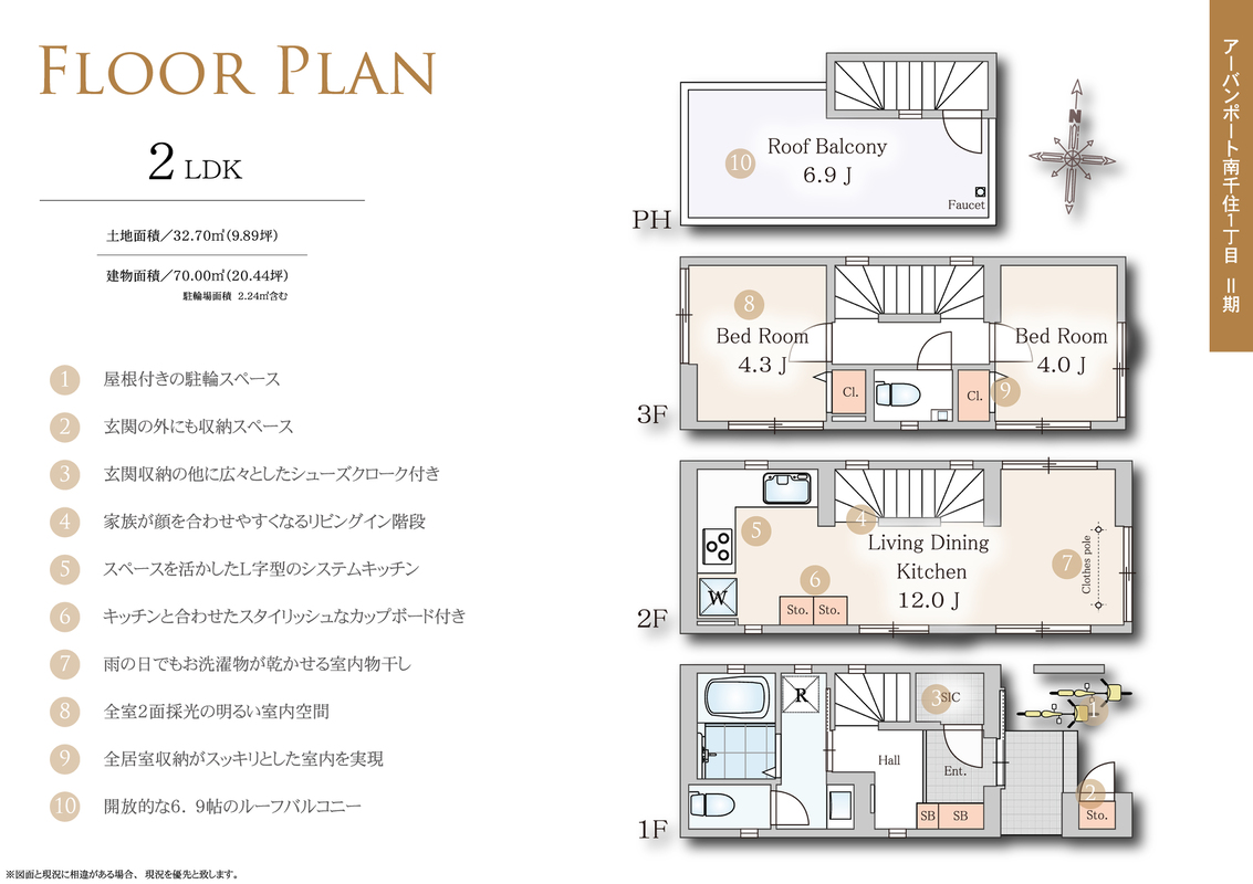 | 建物面積 | 70.00m2(駐輪場面積2.24m2含む) | 土地面積 | 32.70m2 |