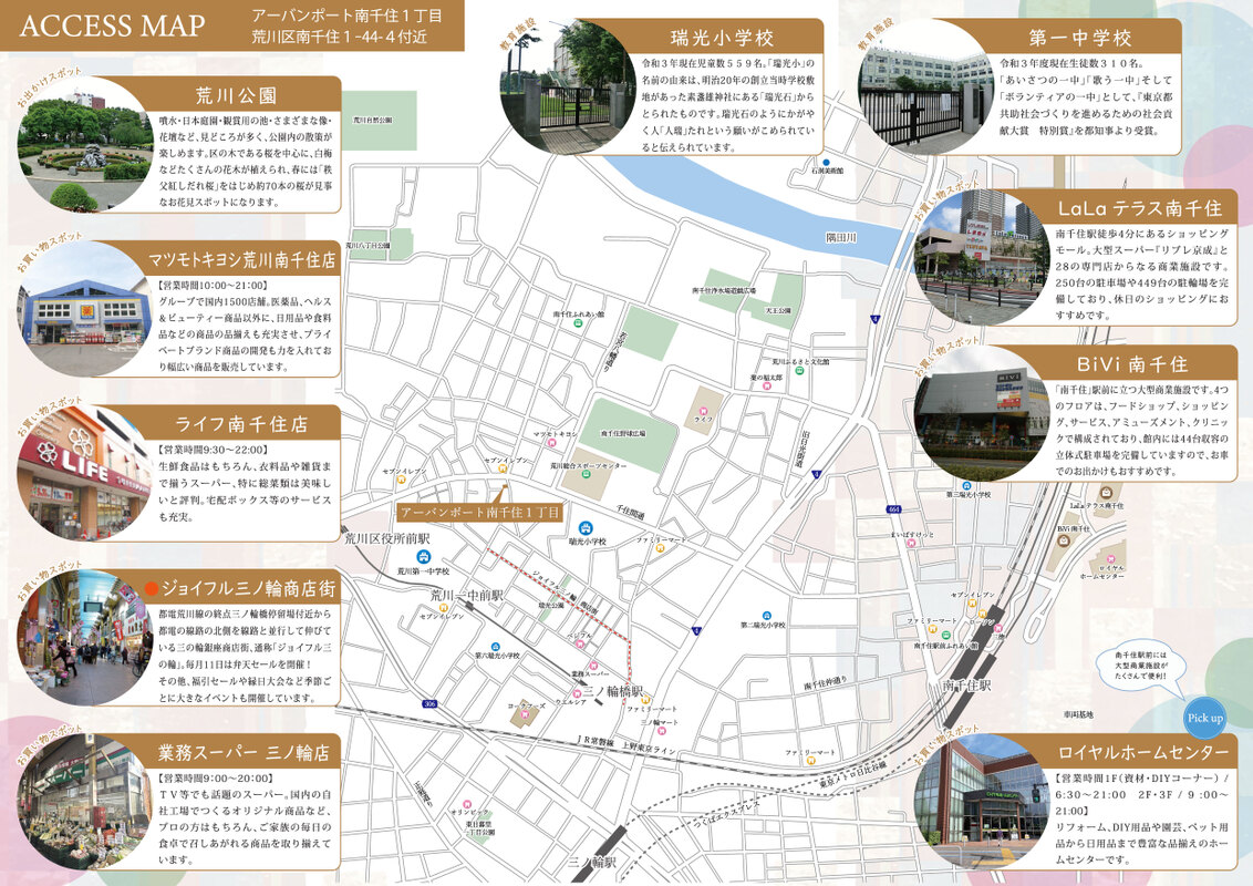 都電荒川線「荒川一中前」駅 徒歩4分 東京メトロ日比谷線「三ノ輪」駅 徒歩11分 JR常磐線「南千住」駅 徒歩13分 |