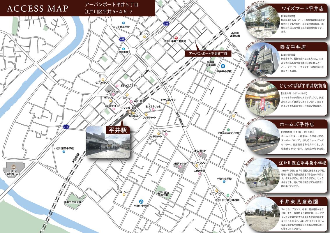 JR総武線「平井」駅 徒歩8分 東京メトロ東西線「葛西」駅 バス29分「平井四丁目」バス停 徒歩6分 都営新宿線「東大島」駅 バス12分「平井駅前」バス停 徒歩8分 |