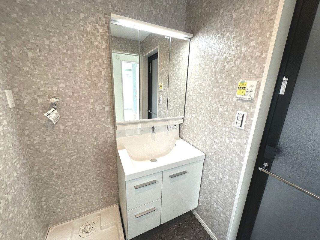 大きな三面鏡、実用性と機能美を兼ね備えた先進の洗面化粧台。ノズ...