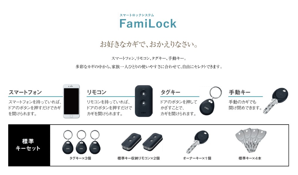 ■全邸宅配BOX採用 ■食器洗い乾燥機、ホーローキッチンパネルなど高品質アイテム採用のキッチン ■安心・操作がしやすく便利な電子キー『Fami Lock』採用
