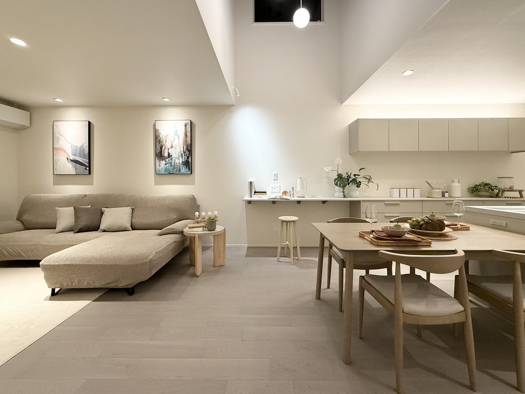 一直線上にLDKを配置し、南北にそれぞれプライベートガーデンと繋がる大きな出入窓を設けました。また、LDKの中心には吹抜けを設け、明るく開放感のある空間を演出しました。