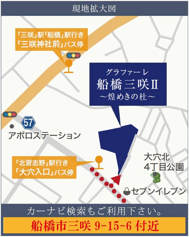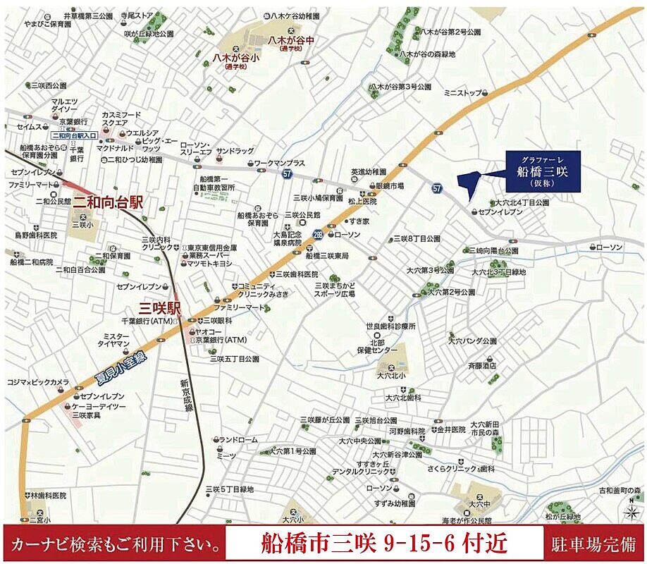 京成松戸線「三咲」駅 徒歩19分~21分 JR総武線「船橋」駅 新京成バス「三咲神社前」 徒歩6分~7分 東葉高速鉄道「船橋日大前」駅 車で約5.4km |