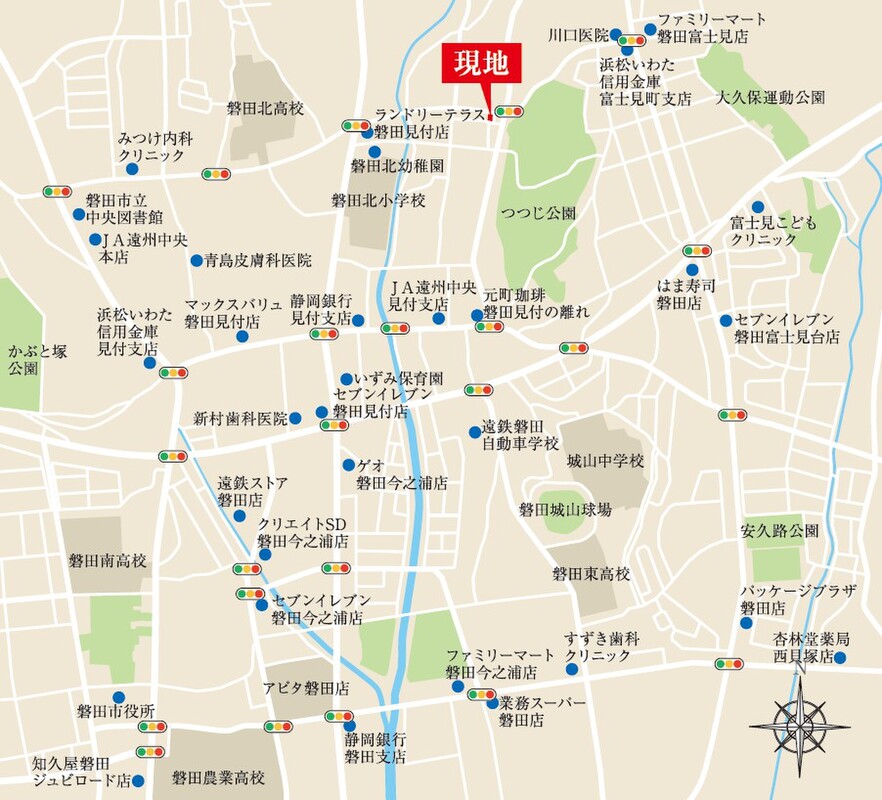 磐田北小学校へ徒歩9分(約650m)、城山中学校へ徒歩14分(約1.1km)で通学しやすい立地。つつじ公園も徒歩6分(約440m)。