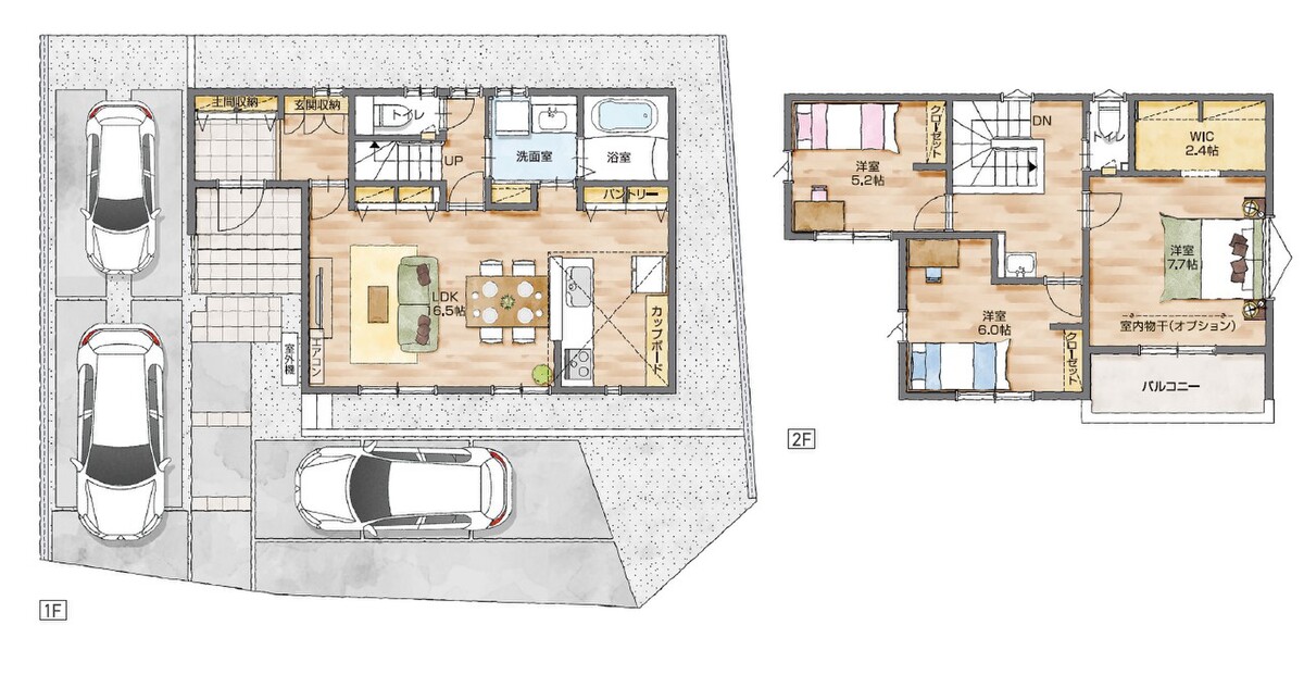 駐車スペース3台確保!各居室に収納完備。タカラスタンダード製の住宅設備!キッチンは食洗器付き・洗面化粧台はゆったり90cm幅・ユニットバスはお手入れしやすい磁器タイル床。