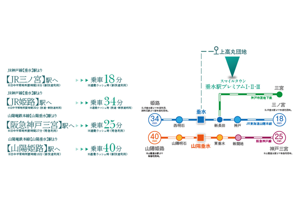 JR「垂水」駅、山陽電鉄「山陽垂水」駅徒歩19~22分、自転車約7分の距離で通勤通学にも便利。