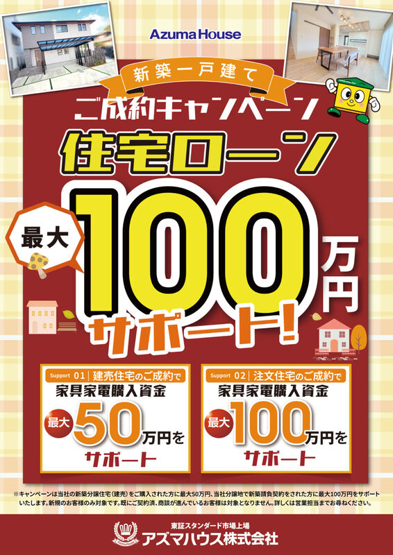 ●当社新築建売住宅をご購入の方を対象に、 「住宅ローンサポート ご成約キャンペーン」実施中! キャンペーン期間:2026年1月31日(土)まで 詳しくはお問い合わせください! ●期間中に当社新築建売住宅をご購入の方を対象に、 「お年玉キャンペーン」実施中! LDK用エアコンor家具のいずれか1つをプレゼントいたします! ※エアコンは当社指定品、家具はダイニングテーブル・椅子セットまたはソファのどちらかとなります。 キャンペーン期間:2026年1月6日(火)~1月31日(土) 各種キャンペーンについて、詳しくは営業担当者までお尋ねください! もっと物件を探すなら…。他にも物件を見たい方はこちら https://www.azumahouse-osaka.com/ 注文住宅もありかも?!と思ったら…。理想の住まい実現への第一歩はこちら https://azumahouse-osakaoffice.com/order/ 大阪で分譲地~Life Field Field~ライフフィールド~を探すなら。詳細はこちら https://azumahouse-osakaoffice.com/land_of_sale/ 現在お家をお持ちなら…。相談無料!プロのアドバイザーに相談したい方はこちら https://www.azumahouse-osakasale.com/ アズマハウスってどんな会社?詳しくはホームページで! https://azumahouse-osakaoffice.com/ |