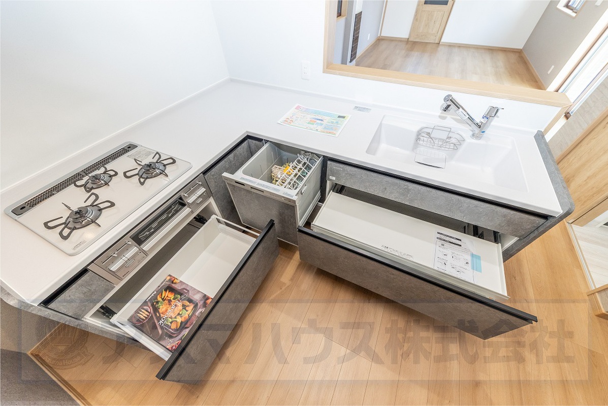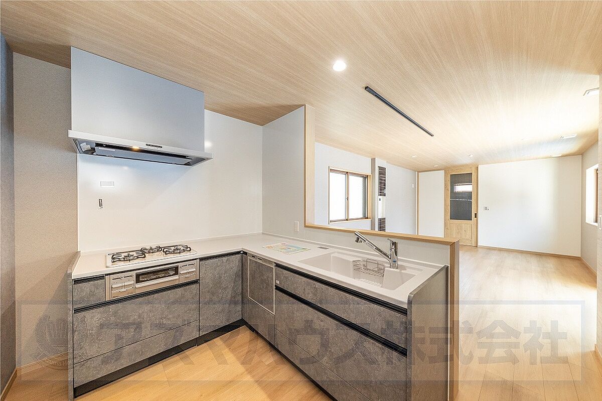 18.5帖の広々LDK!作業効率が良いL型キッチン採用!パントリーをはじめとする収納スペースを随所に設けた、無駄のない空間設計も自慢です。