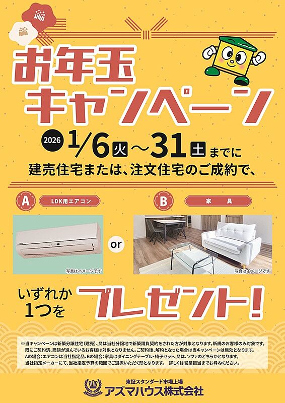 ※準防火地域、高度地区(第二種)他 ●当社新築建売住宅をご購入の方を対象に、 「住宅ローンサポート ご成約キャンペーン」実施中! キャンペーン期間:2026年1月31日(土)まで 詳しくはお問い合わせください! ●期間中に当社新築建売住宅をご購入の方を対象に、 「お年玉キャンペーン」実施中! LDK用エアコンor家具のいずれか1つをプレゼントいたします! ※エアコンは当社指定品、家具はダイニングテーブル・椅子セットまたはソファのどちらかとなります。 キャンペーン期間:2026年1月6日(火)~1月31日(土) 各種キャンペーンについて、詳しくは営業担当者までお尋ねください! もっと物件を探すなら...。他にも物件を見たい方はこちら https://www.azumahouse-osaka.com/ 注文住宅もありかも?!と思ったら...。理想の住まい実現への第一歩はこちら https://azumahouse-osakaoffice.com/order/ 大阪で分譲地~Life Field~ライフフィールド~を探すなら...。詳細はこちら https://azumahouse-osakaoffice.com/land_of_sale/ 現在お家をお持ちなら...。相談無料!プロのアドバイザーに相談したい方はこちら https://www.azumahouse-osakasale.com/ アズマハウスってどんな会社?詳しくはホームページで! https://azumahouse-osakaoffice.com/ |