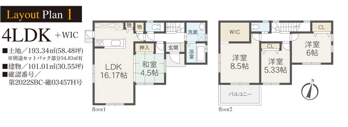 | 建物面積 | 101.01m2(30.55坪) | 土地面積 | 184.98m2(55.95坪)・193.34m2(58.48坪) |