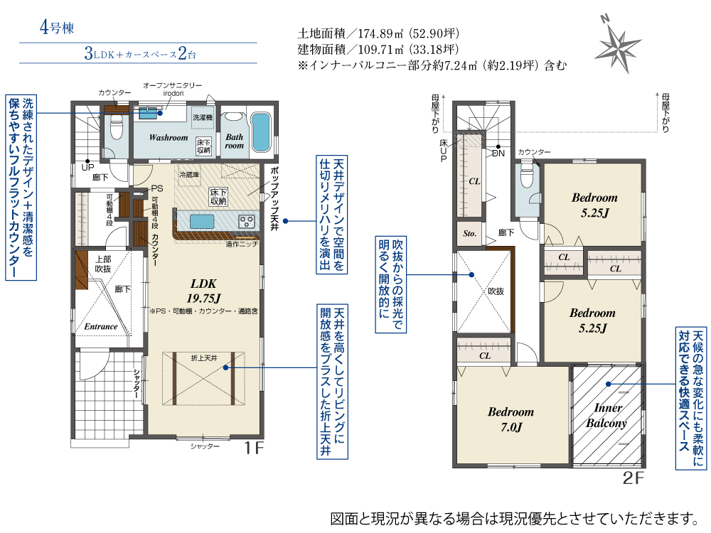 | 建物面積 | 105.16m2(約31.81坪)~109.71m2(約33.18坪) | 土地面積 | 159.72m2(約48.31坪)~191.19m2(約57.83坪) |