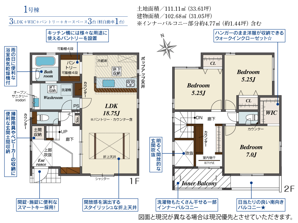 | 建物面積 | 102.68m2(約31.06坪) | 土地面積 | 111.11m2(約33.61坪) |