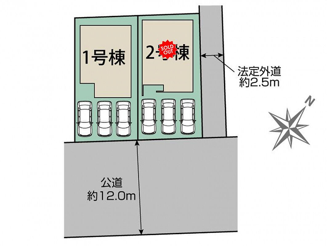 | 駐車場 | 3台 | 道路の幅員 | 南側約12.0m公道、東側約2.5m法定外道 |