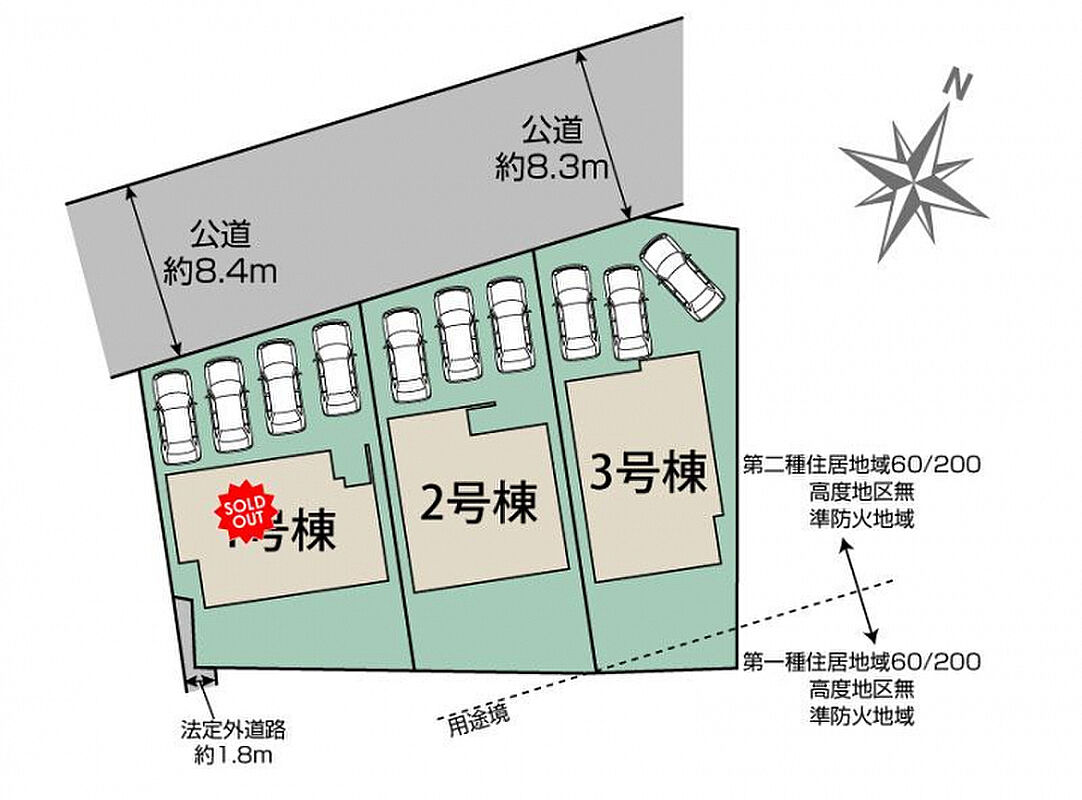 | 駐車場 | 3台 | 道路の幅員 | 北8.3m公道、南1.8m法定外道路 |