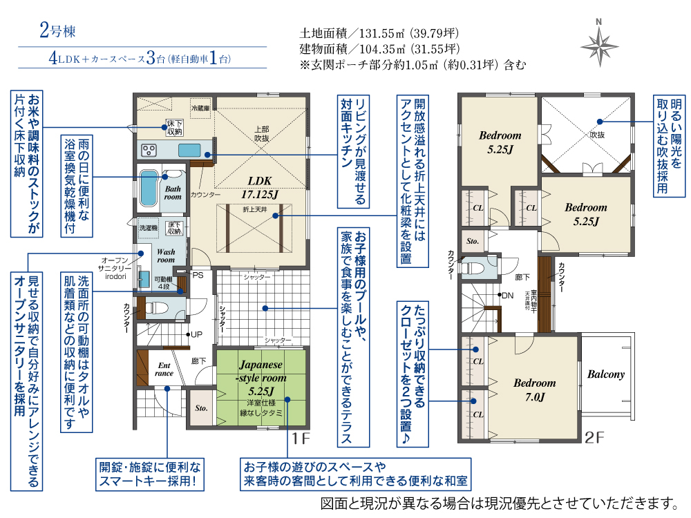 | 建物面積 | 104.35m2(約31.56坪)~111.99m2(約33.87坪) | 土地面積 | 131.54m2(約39.79坪)~131.55m2(約39.79坪) |