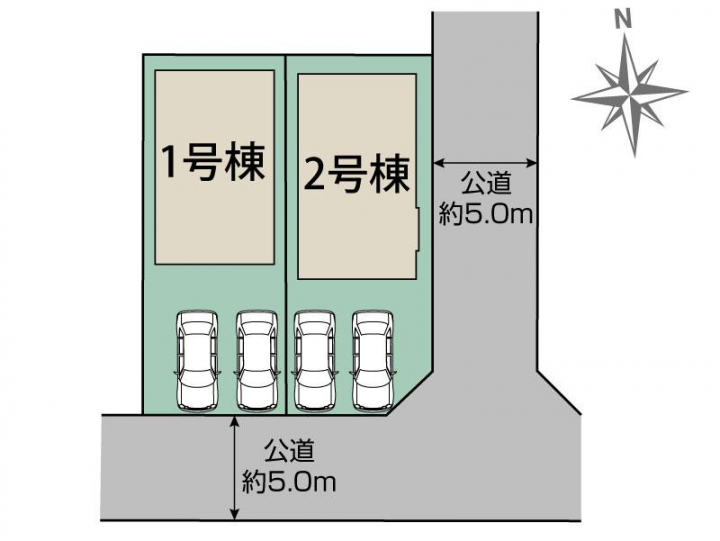 | 駐車場 | 2台 | 道路の幅員 | 南5.0m公道、東5.0m公道 |