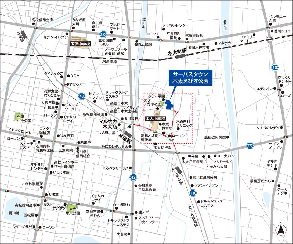 最寄りのことでん「林道」駅からことでん「瓦町」駅まで2駅木太小学校やマルナカ木太店などが身近にそろう街
