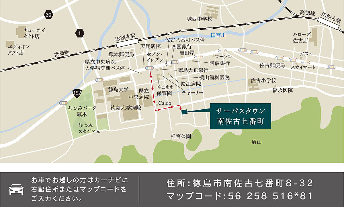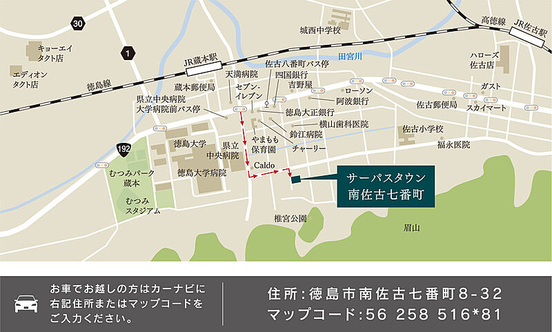 JR徳島線「蔵本」駅 徒歩12分~13分 5号地から徒歩12分(約960m)、12号地から徒歩13分(約970m) |