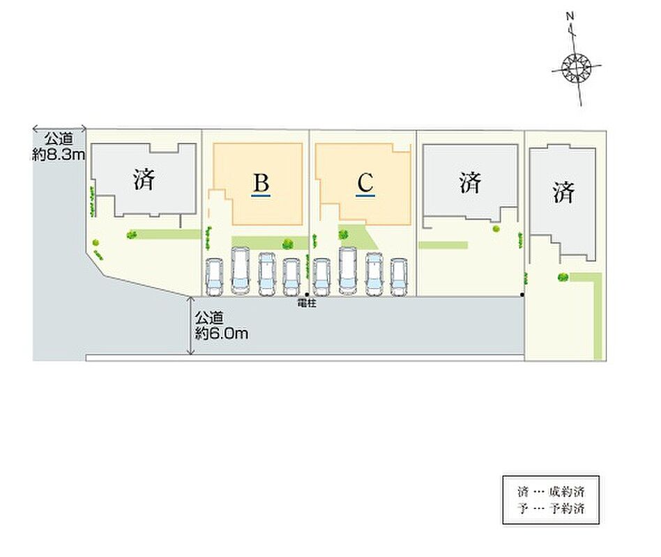 | 駐車場 | 4台 | 道路の幅員 | 公道:西側約8.3m・南側約6.0m |