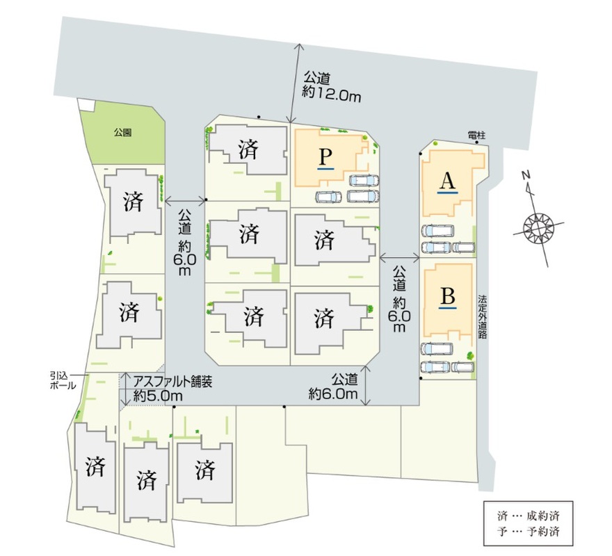 | 駐車場 | 3台 | 道路の幅員 | 北側約12.0m公道、西側約6.0m公道 |