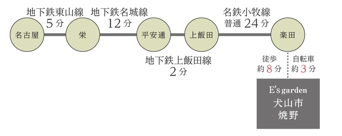 名鉄小牧線「楽田」駅 徒歩8分 自転車約3分 犬山市コミュニティバス「西北野」バス停 徒歩1分 |