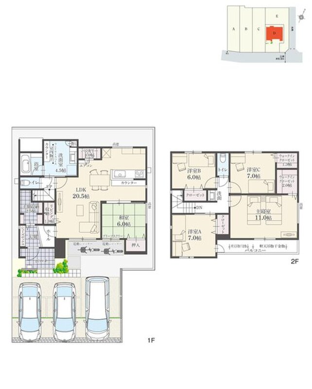 | 間取り | 5LDK | 建物構造 | A・B・D・E棟:木造瓦及びガルバリウム鋼板葺2階建、C棟:木造瓦葺2階建 |