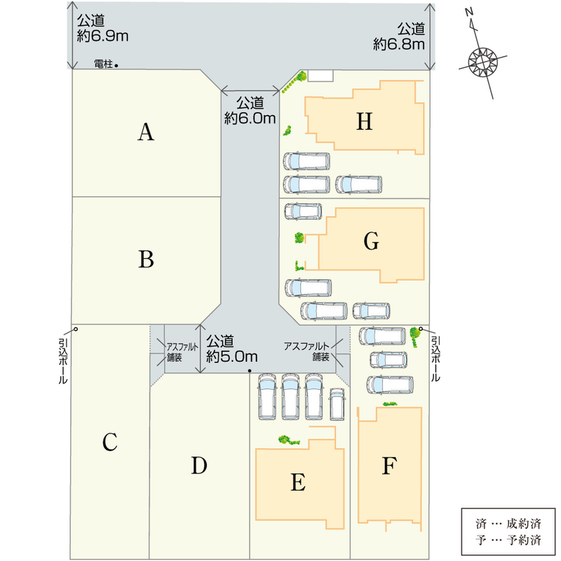 | 駐車場 | 3台 ~ 4台(E 棟・G棟(4台)、F棟・H棟(3台)) | 道路の幅員 | 幅員約5.0m~6.9m公道、私道負担有(詳細は備考) |
